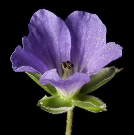 Inflorescence: Flowers blue or blue purple, veined yellow or white, 20mm across; sepals large to 15mm, with retrorse eglandular hairs, mucro 2mm, flower buds oval, not furry. Foveole usually eglandular, with 0-